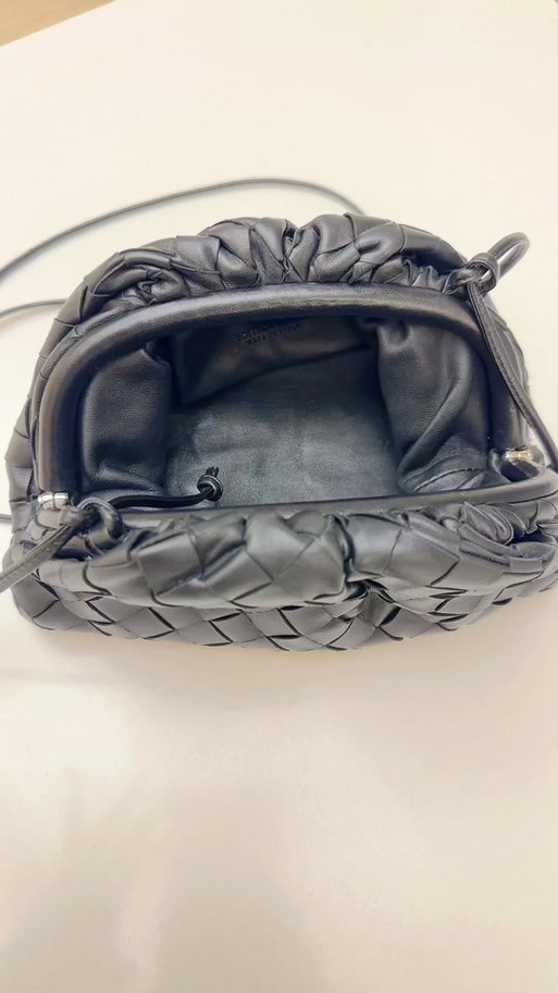 Pouch 的 Intreccio 编织是标准款式,皮条宽度约 1cm。与 Cassette 的核心差异在于:Cassette 有内部骨架支撑包型,Pouch 完全没有。整只包的形状只来自编织皮革本身的张力,放下时会随重力微微变形,拿起时恢复柔软立体感。
