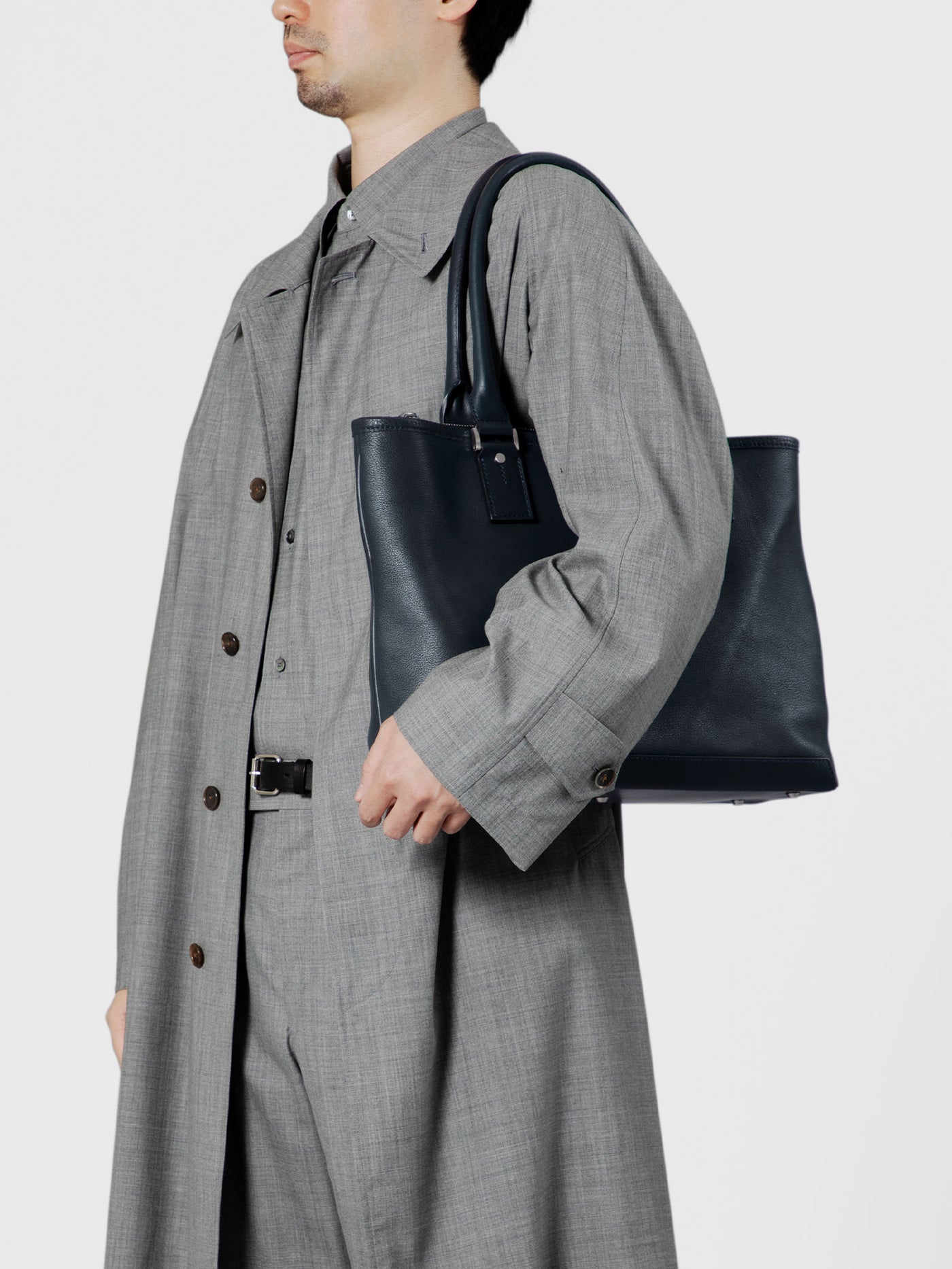 包体结构简洁:正面单片皮革,无多余口袋,无装饰缝线,只有马鞍缝工艺固定的手提带和侧边。这种"什么都没有"的设计决策,在日本职人文化语境里叫做引き算(减法)——通过减去所有不必要的东西,让材质本身成为唯一的主角。